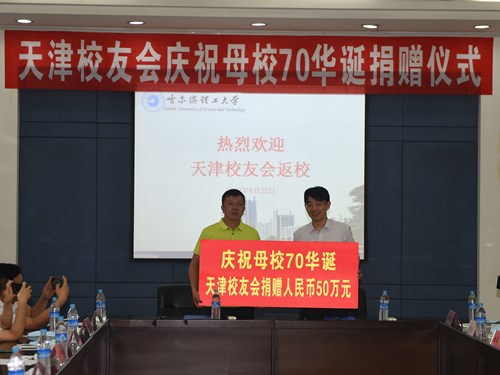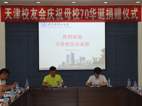 在学校即将迎来庆祝建校70周年之际,天津校友会为母校70华诞献礼,向母校捐赠了人民币50万元用于支持庆祝建校70周年活动及学校发展建设。8月22日下午,校友总会在西区1号楼第四会议室举办了捐赠仪式,校党委副书记陆岩出席了仪式,校友总会、教育发展基金会相关人员,校庆办相关人员,相关院系领导及教师参加了仪式,天津校友会副会长涂强、吴宝强,秘书长周展缨,常务副秘书长王雷、郑风振,副秘书长吴景颖,理事郎家军、邢如玉、谢福金,校友邓禹等代表天津校友会返校捐赠。仪式由学校校友总会秘书长、教育发展基金会理事长王俊明主持。